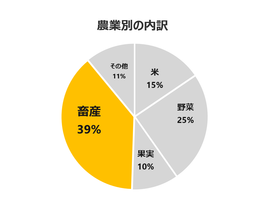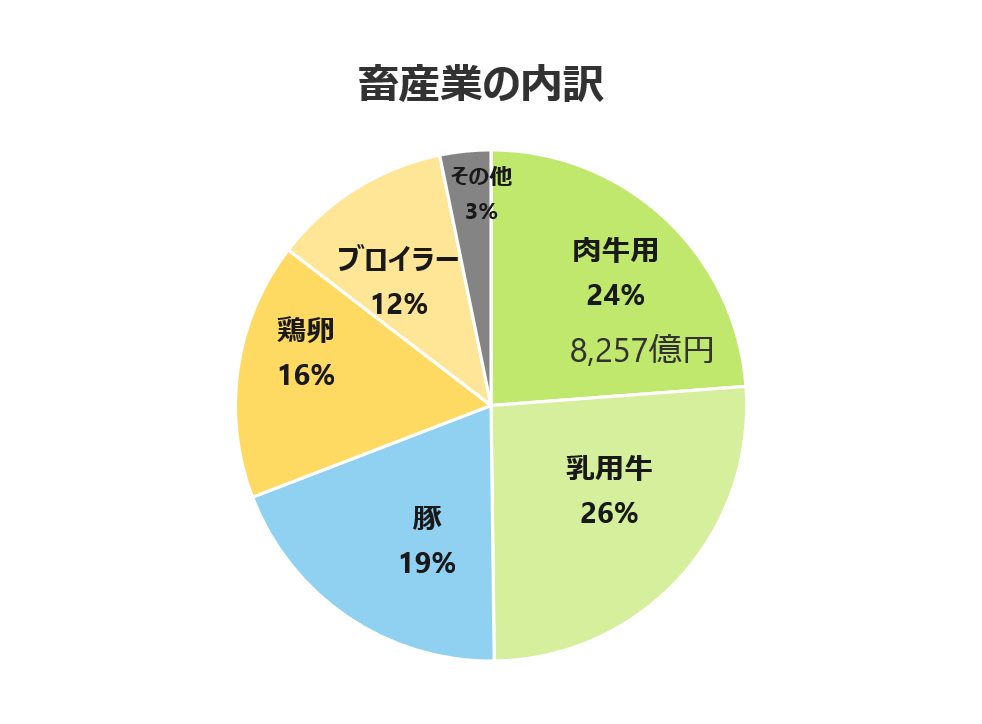 - 農業全体9兆15億円の内、畜産業は39%の3兆4,678億円を占めています。
